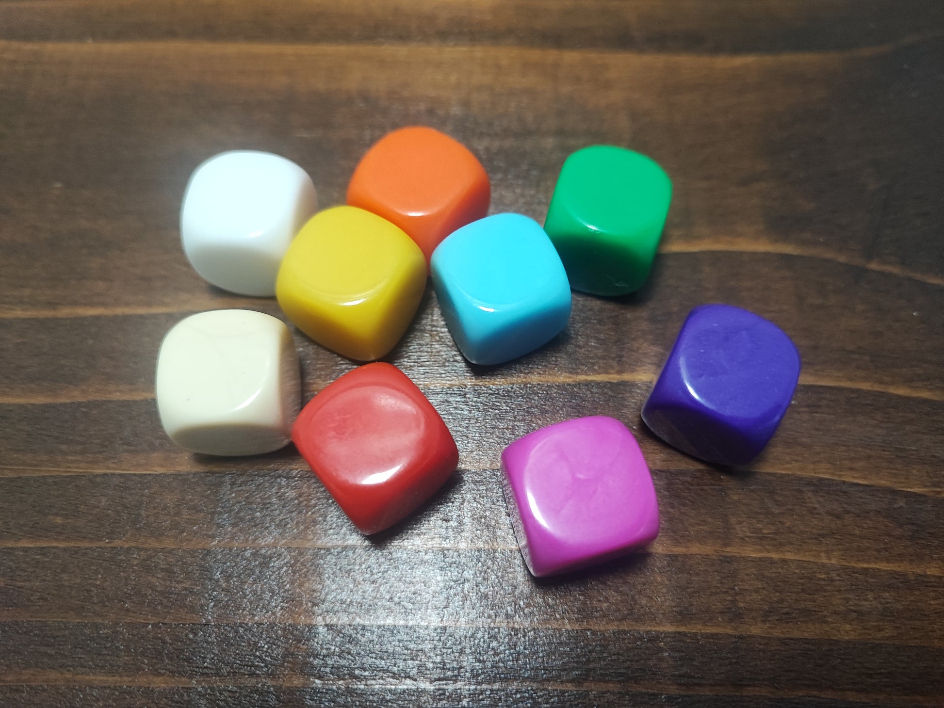 Blanko oder Kinderwürfel mit Zahlen 1 bis 2€ drauf. Würfel mit zufälliger Farbe.