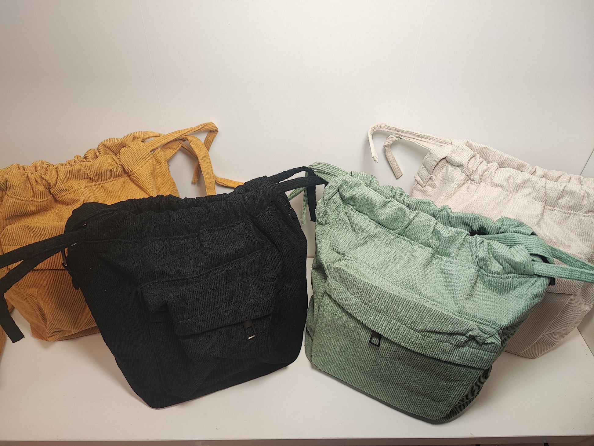 Die Tasche besteht aus Kordstoff und hat eine Außentasche und im inneren auch noch ein kleines Fach.