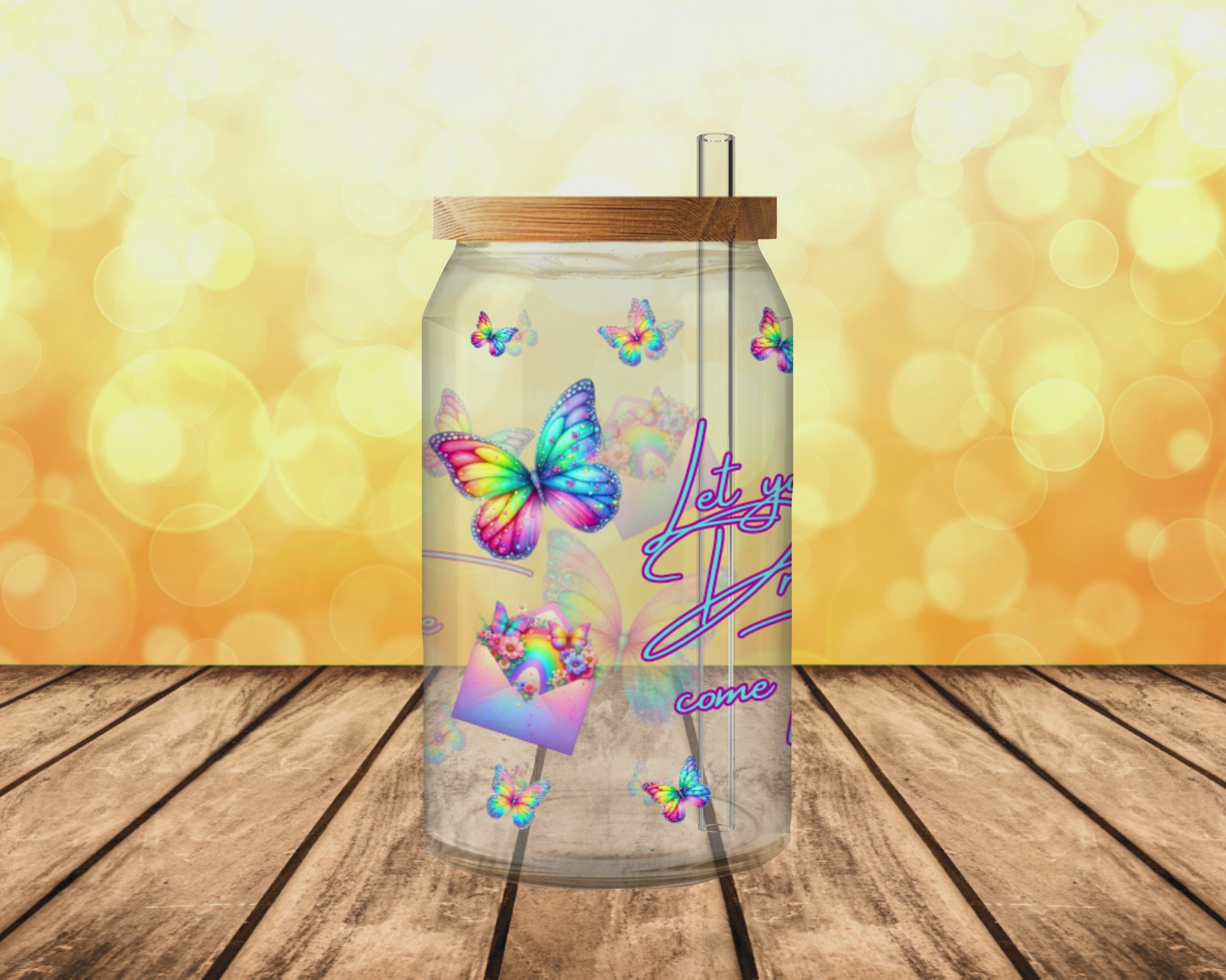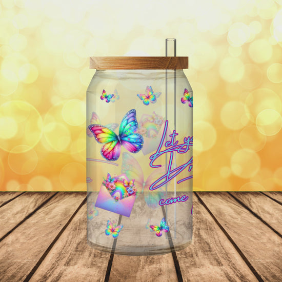 Das Trinkglas aus Glas kommt mit einem Bambusdeckel und einem Glasstrohhalm und das Trinkglas aus Kunststoff kommt mit einem Kunststoffdeckel und Kunststoffstrohhalm.